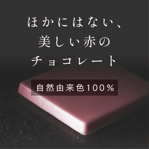 Color 粉末状のビーツやハイビスカスを混ぜて表現した自然由来100%カラー。合成着色料不使用のチョコレートです。Message of happiness 赤は幸せを結ぶ色 恋愛や幸せを結ぶ色として、「運命の赤い糸」や、魅力的に見せる「ロマンティックレッド」などと呼ばれています。あなたを幸せに導く縁を結びますように、願いを込めて。