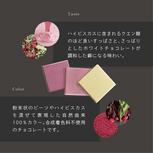 福井県にある横井チョコレートは昭和20年創業のチョコレートメーカー。横井社長らチョコレートと常に向き合ってこられました。「カレ・ド・カラーズ」シリーズは、組み合わせる植物の色、味わいの特徴を最大限に引き立てるように、それぞれに合ったチョコレートを厳選しブレンドしています。全く新しい感動の「自然由来色」カラーチョコレート誕生。豊富な美容成分ハイビスカス ホワイトチョコレート軽やかな味わい 2つの素材が引き立つ大人の味 Taste ハイビスカスに含まれるクエン酸のほど良いすっぱさと、さっぱりとしたホワイトチョコレートが調和した癖になる味わい。