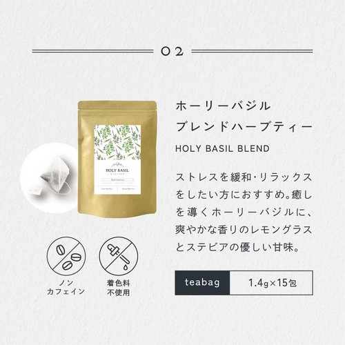 | 【原材料名】 | ホーリーバジル(ラオス産)、レモングラス(タイ産)、ステビア(パラグアイ産) |